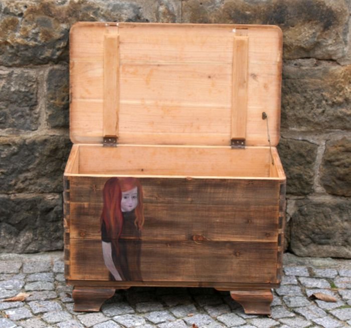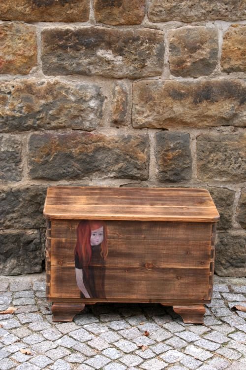 angeschliffen/holzsichtig mit Klarlack auf Acrylsasis versiegelt, darauf Malerei in Öl