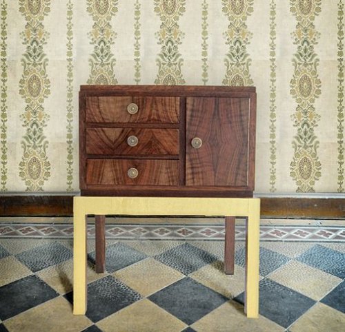 Korpus aus Esche mit nußbaumfurnierten Schubladen und Türchen, Knäufe aus Messing, Füße vergoldet mit Orange - Doppelgold 23 Karat